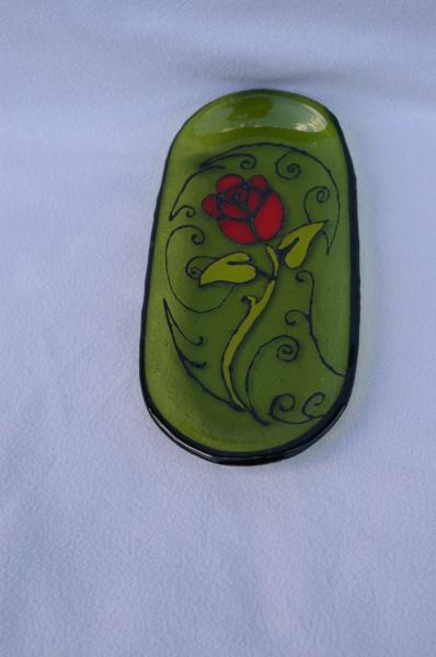 Plat ovale verre vert avec Rose peinte 16,5x8cm