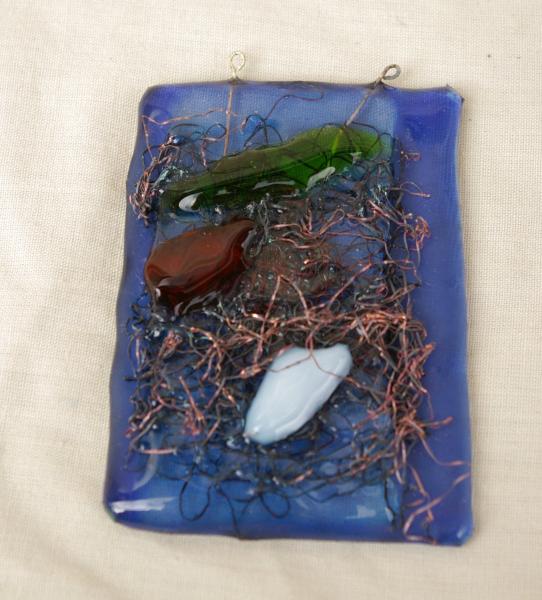 Supsens vertical bleu et morceaux couleurs filet cuivre 6X8cm