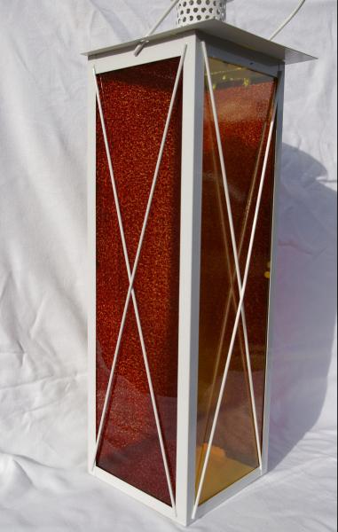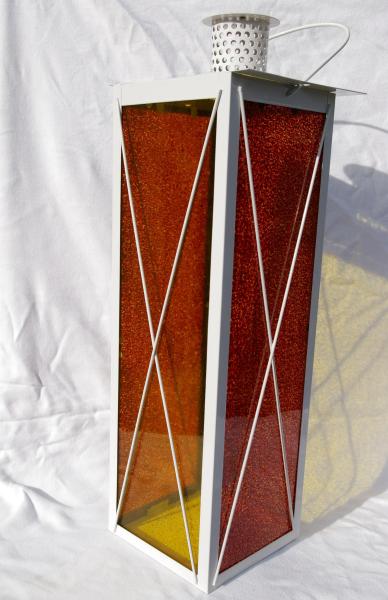 Lanterne métal balnche avec croisillon émail jaune et pourpre 15X15X44cm + cheminée et hanse