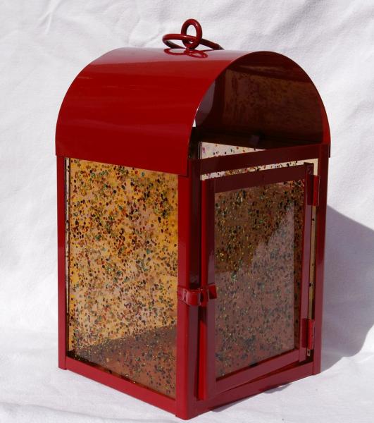 Lanterne en métal rouge avec de l'émail jaune et des frites multicolores Dimensions: 16.5 x 16.5 x 28cm (sans l'anse)