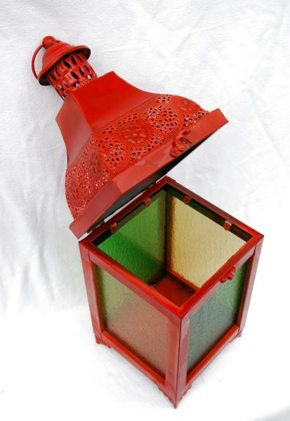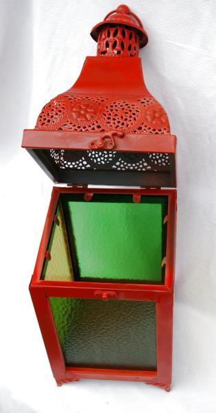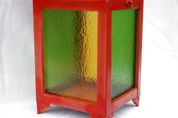 Lanterne en métal rouge avec des verres structurés vert et jaune, ouverture par le couvercle Dimensions: 17 x 17 x 25.5cm