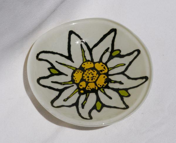 Petite assiette ronde couleur blanc cassé avec une peinture d'Edelweiss Diamètre: 15cm