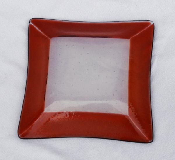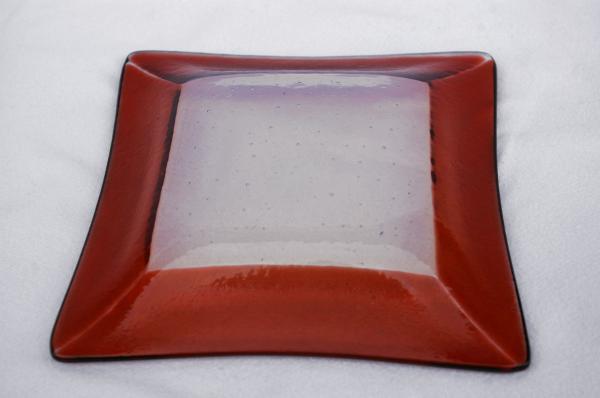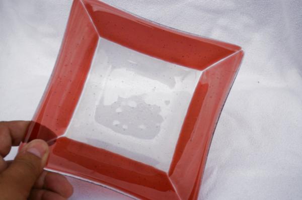 Plat carré couleur saumon et blanc transparent (couleur changeant selon l'angle) Dimensions: 14 x 14cm