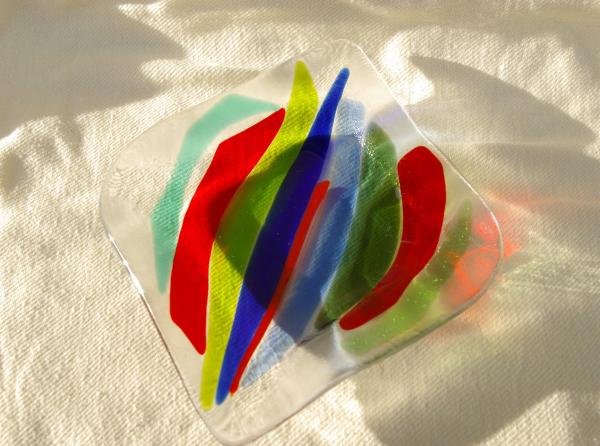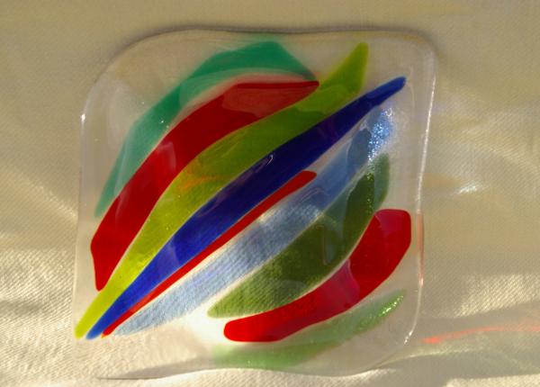 Coupelle carrée avec des angles arrondis et des morceaux de couleurs Dimensions: 14 x 14,5cm
