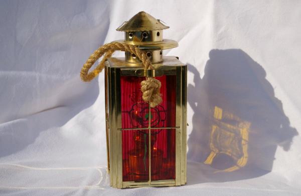 Lampe à huile dorée avec corde, émail jaune et rouge, fleures peintes Dimensions: 11 x 11 x 18cm (sans le couvercle) Hauteur avec couvercle: 25cm