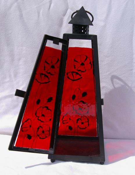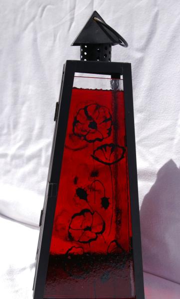 Fusing rouge coquelicot peint en noir 13 x 13 x 29,5 cm ! une des faces et faites de 3 morceaux de verre rouge sur 1 seul de transparent (Cela n'enlève rien à la solidité c'est juste visuel, toujours dans mon approche de rien de se jette tout se transforme)