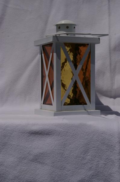 Lanterne métal blanc avec croisillons, verres jaune structuré et lilas pâle 10x10x15,5cm + hanse 10cm