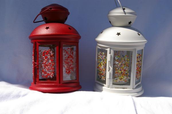 Lanterne métal blanche hexagonale avec frites de verres multicolore Ø 12cm H 20cm sans hanse