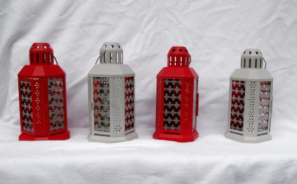 Lanterne métal gris ajourées verres rouges et transparents sablage croix Suisse 10x10x22cm