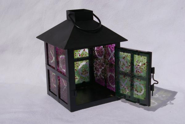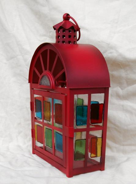 Petite lanterne métal rouge H 23cm L 16cm P 8.5cm +cheminée et boucle 11cm sans les suspens intérieur